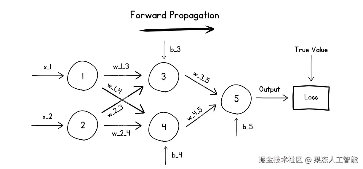 接下来,前向传播得到的输出会和输入数据对应的真实标签做比较,计算出误差或损失函数。