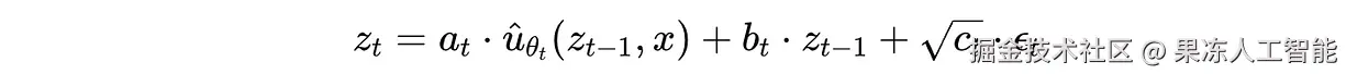 - 带参数 θ 的神经网络 û,乘上系数 a(t) ,根据带噪输入 z(t−1) 和 x 预测去噪后的表示