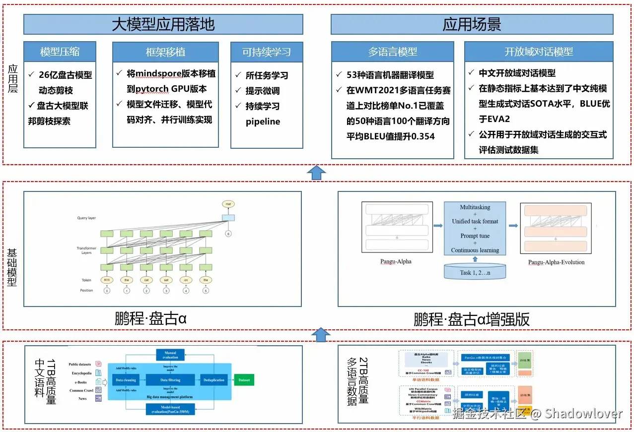 - 应用层:支持常见的 NLP 应用比如多语言翻译、开放域对话等,支持预训练模型落地工具,包括模型压缩、框架移植、可持续学习,助力大模型快速落地。