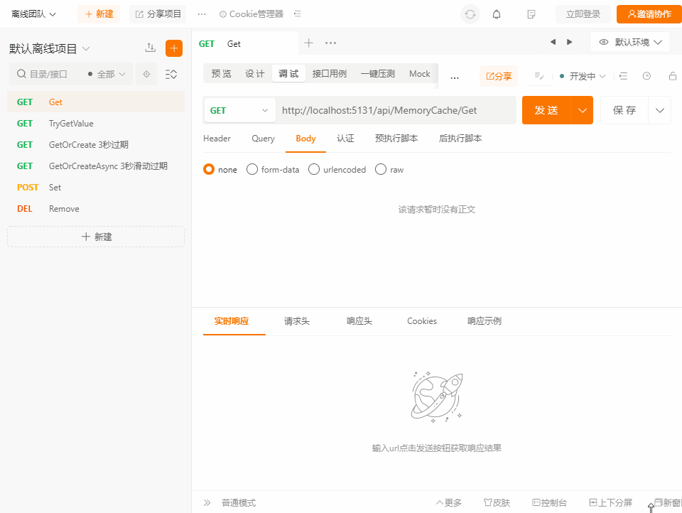 Get、TryGetValue、GetOrCreate、GetOrCreateAsync、Set、Remove,关键参数是过期时间,GetOrCreate、GetOrCreateAsync是通过委托类型的参数设置的,Set方法可以通过参数直接设置,或者使用MemoryCacheEntryOptions,类型有三种: