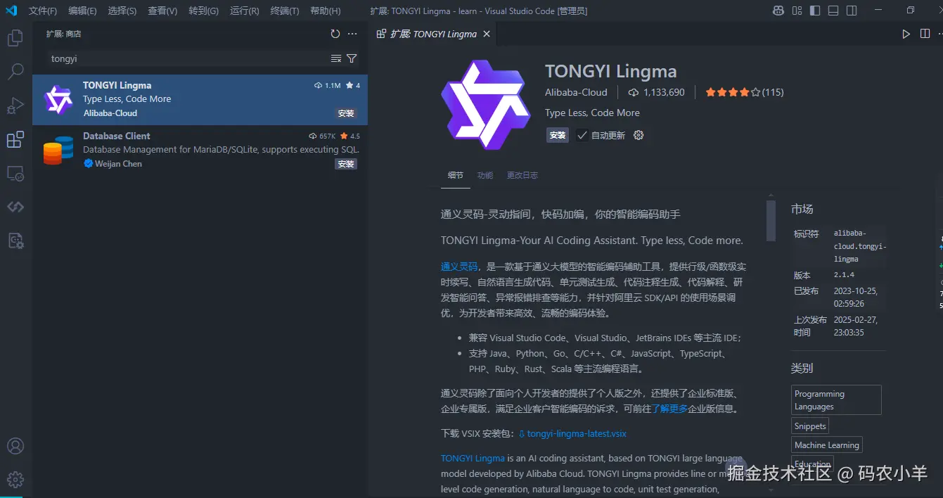 确保已安装 VSCode 后(如未安装请查阅:Visual Studio Code 入门),在插件市场搜索“TONGYI Lingma”,找到通义灵码插件并安装。