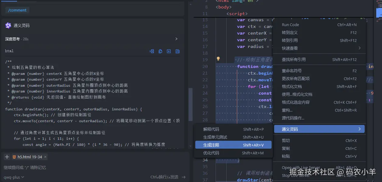 使用代码注释需要先选中需要注释的代码,右键选择通义灵码的生成注释功能,点击即可选择代码注释功能。