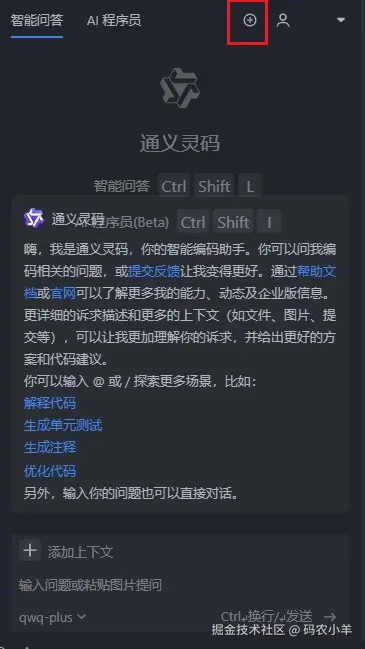 + 号按钮,点击即可创建新对话。