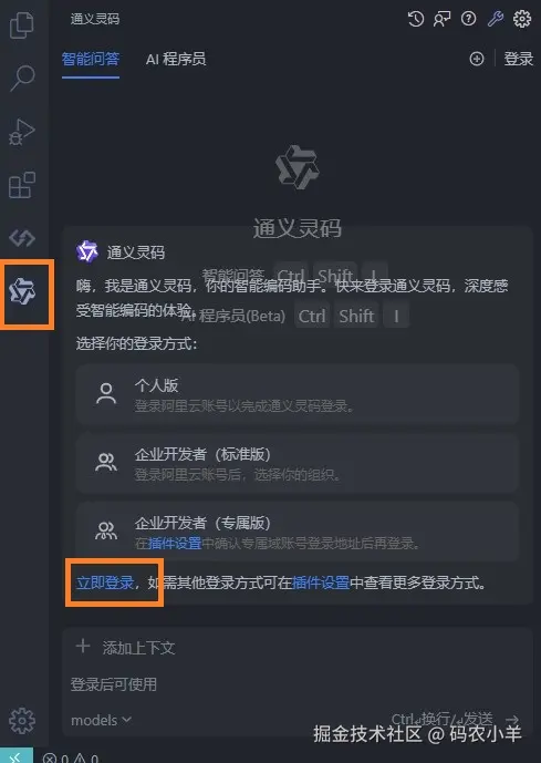 安装完成后,VSCode 左侧会新增通义灵码图标,点击进入插件界面。