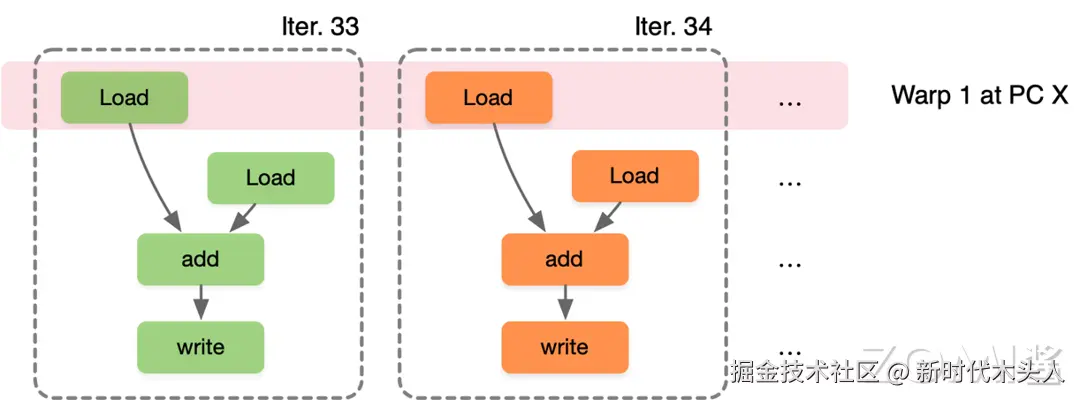 SIMT 架构 GPU 通过细粒度的多线程(Fine-Grained Multi-Threading,FGMT)调度,将处理器的执行流水线细分为更小的单元,使得不同线程的指令可以交错执行,从而减少指令执行的等待时间和资源浪费,以此来实现访存和计算并行。