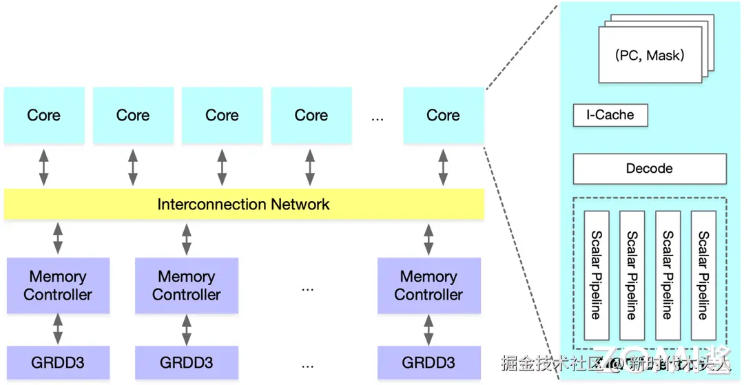 在 GPU 宏观架构层面,GDDR 里面的数据通过内存控制器(Memory Controller)传输到片内总线(Interconnection Network),然后分发到具体的核心(Cuda Core/Tensor Core),在每个执行核心中会有 SIMD 执行单元,从而实现并行计算。