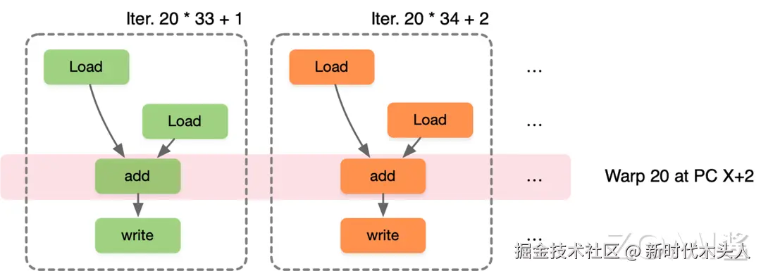 假设一个 Warp 包含 32 个线程,如果需要进行 32000 次迭代,每个迭代执行一个线程,因此需要 1000 个 warp。第一个迭代 Warp0 执行第 032 个线程,第二个迭代 Warp1 执行第 3364 个线程,第二十一个迭代 Warp20 执行第 20x33+1 ~ 20x33+32 个线程,可以看出 SIMT 是标量指令的多个指令流,可以动态地把线程按 Wrap 分组执行,使并行度增加。