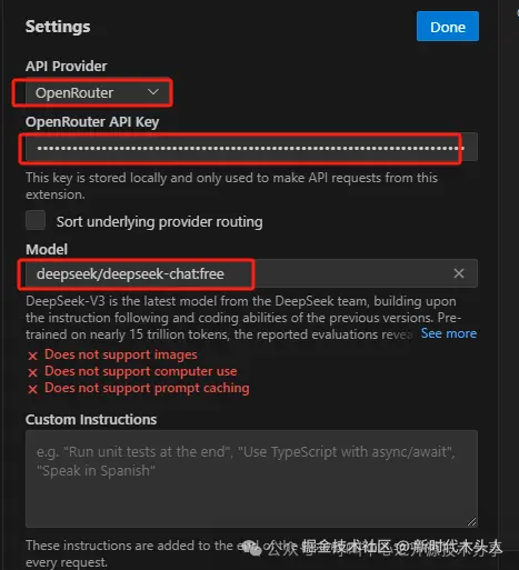 然后在下面的模型,我们选择DeepSeek chat free,也就是DeepSeek V3。把这几项值填下好后,点击done。