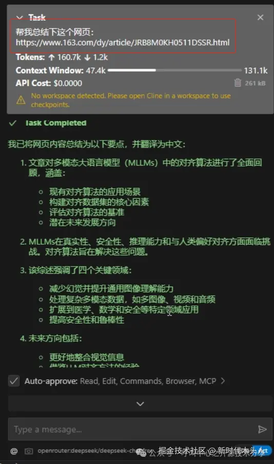 我们看到接下来发生一系列的API调用,最终他成功抓取了网页,并进行了内容总结。任务被成功完成。