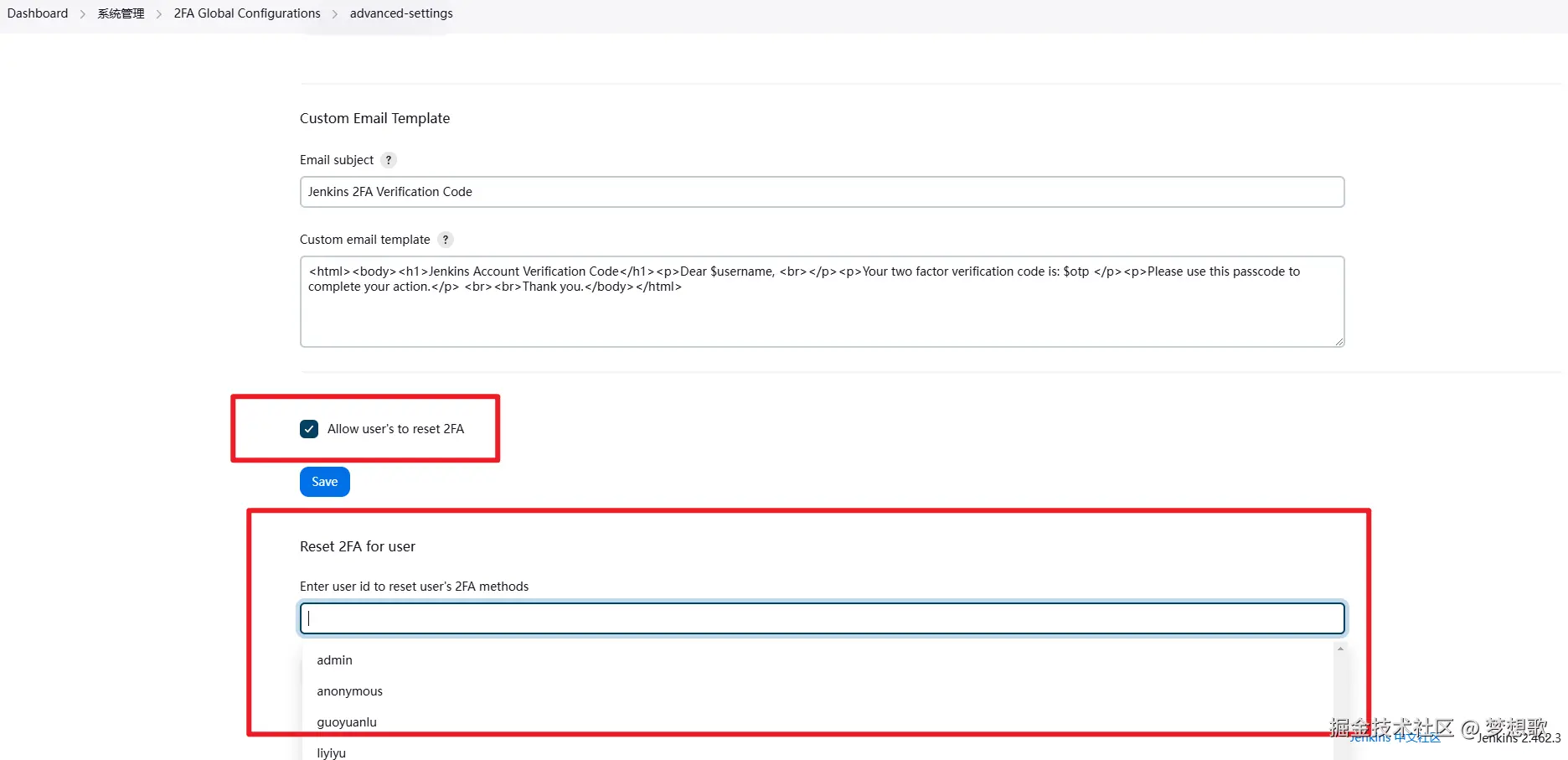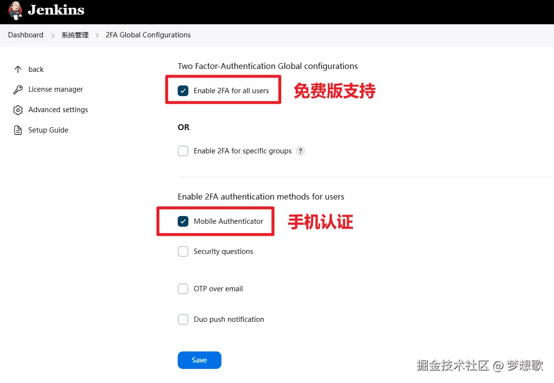 在配置里面勾选 Enable 2FA for all users 和 Mobile Authenticator 表示对所有用户开启 2FA 认证。