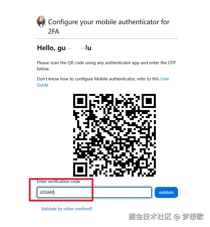 输入用户和密码后,弹出二维码,手机下载 Authenticator 软件,扫码。