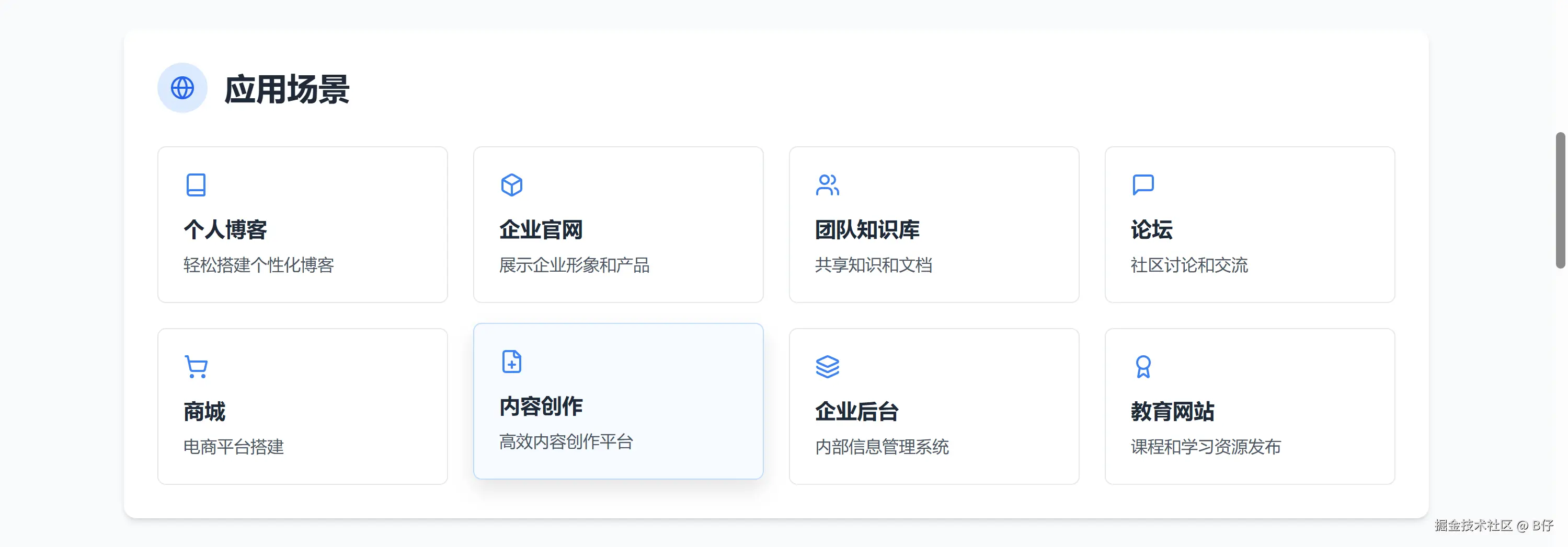 | 文章 | 内容类型 | 发布和管理常规内容(如博客文章、新闻资讯等),支持分类、标签及富文本编辑,支持评论和SEO优化。 |
