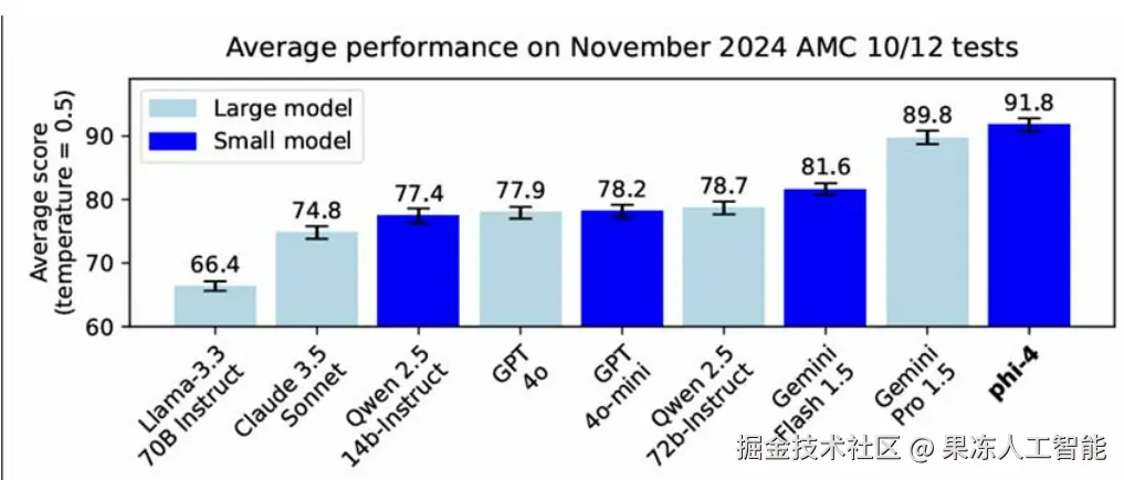 尤其值得注意的是它在数学推理方面的高能力。在由美国数学协会(MAA)主办的美国数学竞赛(AMC)上,Phi-4 在需要逻辑思维的问题(比如复杂方程求解和数学证明)中超过了大模型。