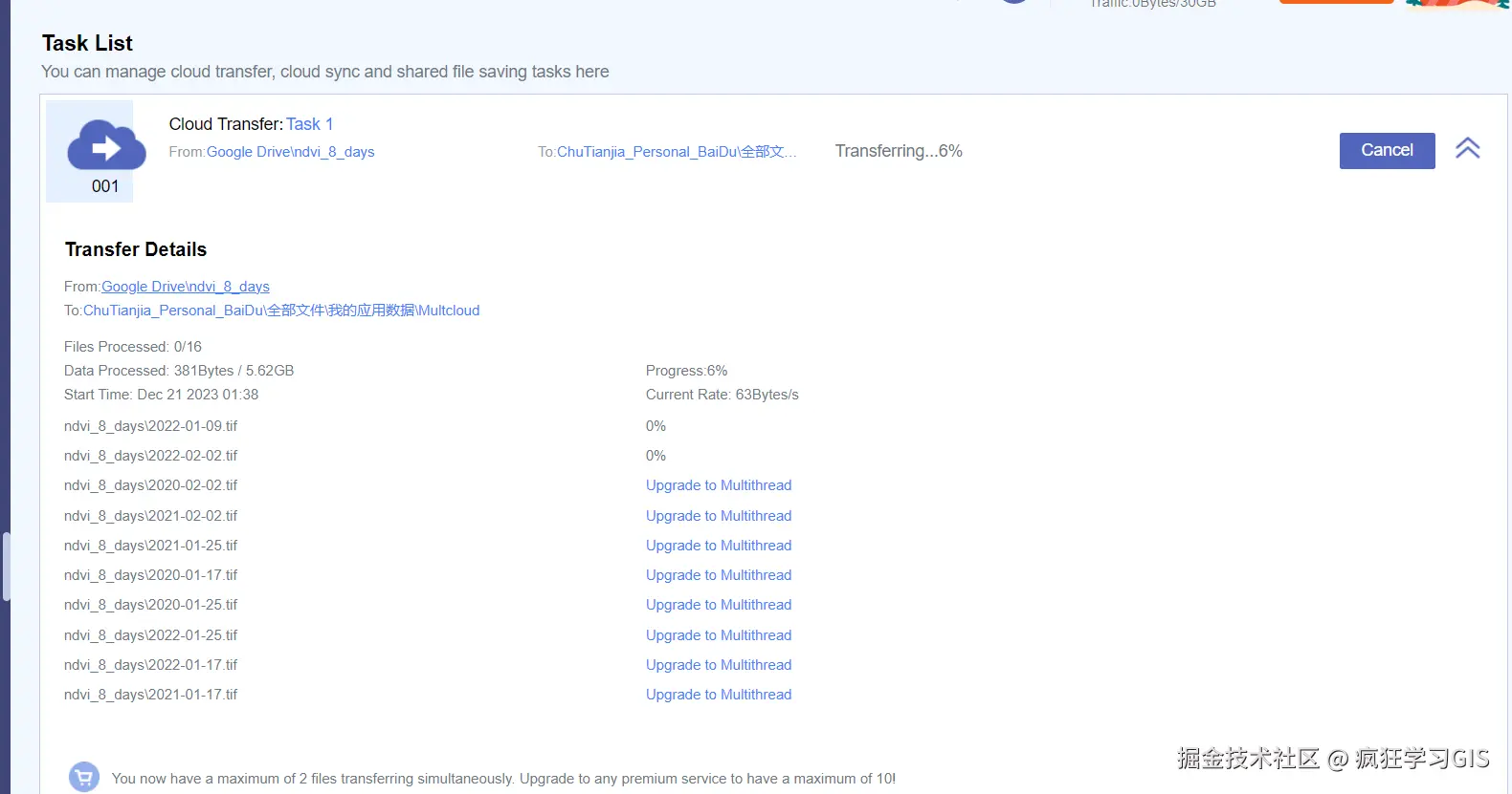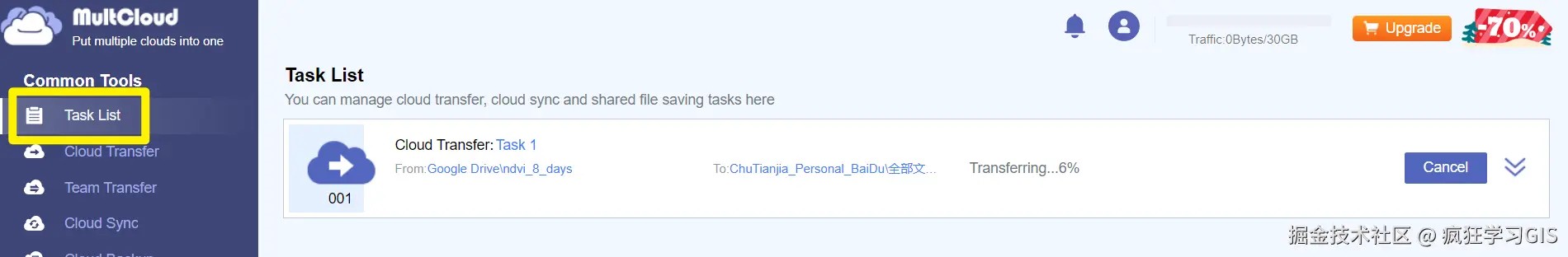 随后,就可以开始传输了。当一个任务开始后,我们可以在MultCloud平台左侧列表中的“Task List”中,看到当前任务执行的情况与进度;如下图所示。