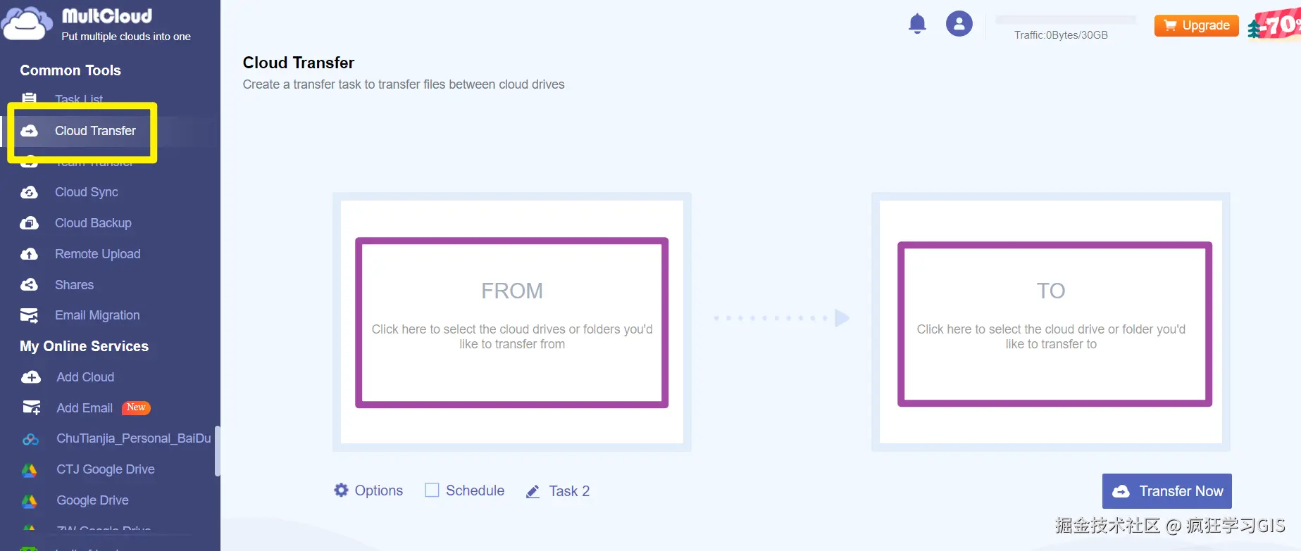 那么,我们就选择MultCloud平台左侧列表中的“Cloud Transfer”选项,并配置好文件传输的来源网盘和目标网盘;如下图所示。