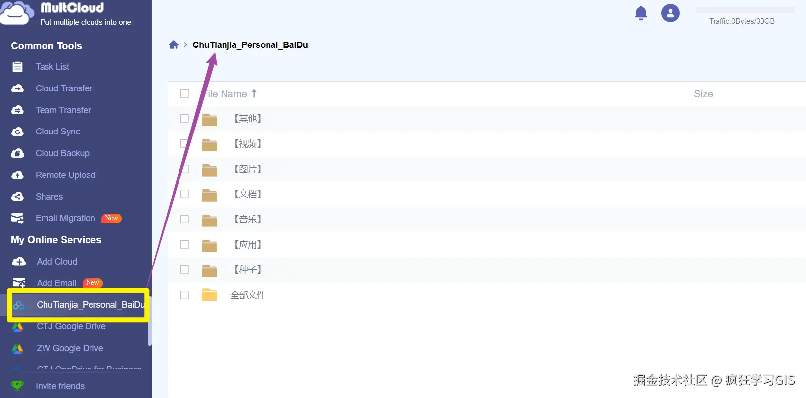 授权完毕后,即可在MultCloud平台左侧列表中,看到我们刚刚添加好的百度网盘。其中,在MultCloud平台内可以看到百度网盘内的一级文件夹;如下图所示。