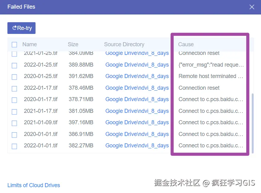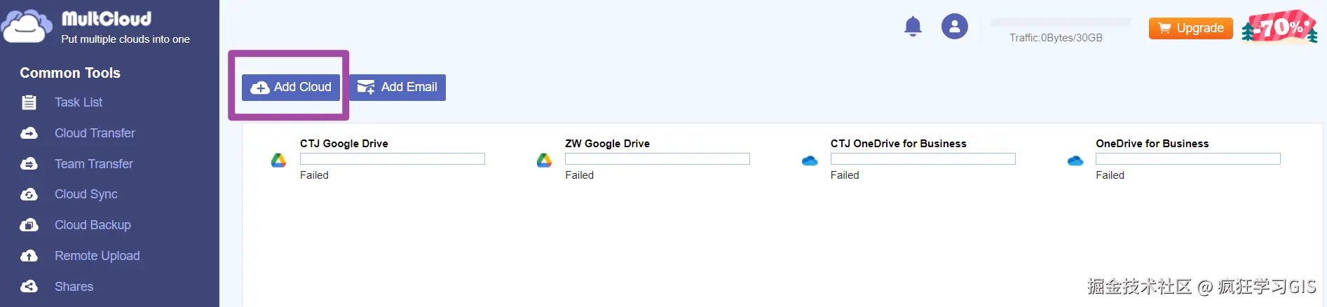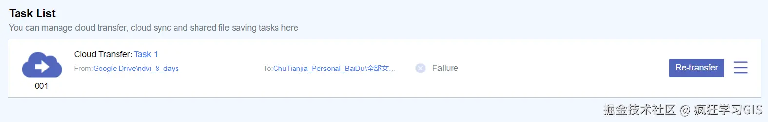 让我们回到正题,前面说到,执行“Cloud Transfer”选项后,我们可以看到其具体进度。如果在进度状态中,发现这个传输任务已经成功完成,那么就没问题了。但是也不知道我这里数据量是太大了,还是说MultCloud平台现在变得不稳定了(网上都说是后者),我这里提交的传输任务在慢吞吞地进行了2天之后失败了;如下图所示。