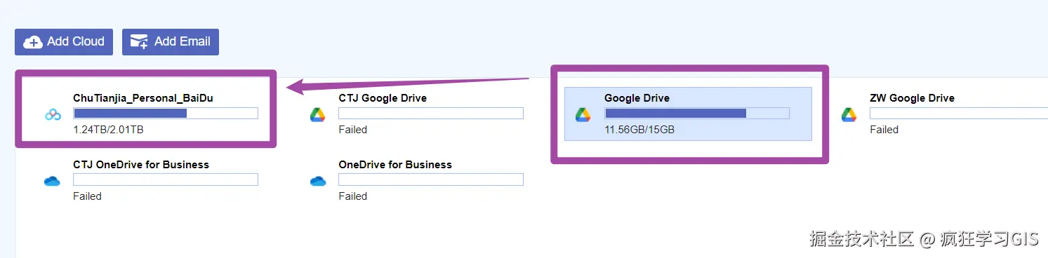 登录账号后,我们就可以选择下图中紫色框内的“Add Cloud”选项,添加我们不同的网盘账户。