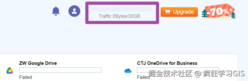 其中,在网页右上角可以看到我们当前剩余的免费传输流量;如下图所示。我这里可能因为账号注册得比较早,所以显示还有30 GB的免费传输流量。