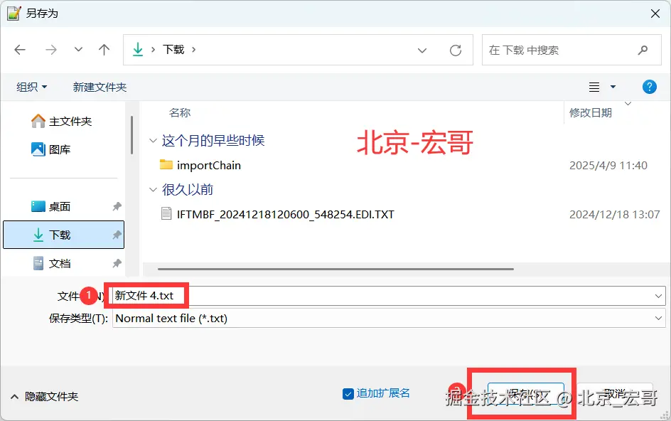 弹出文件选择框是一种用户界面组件,允许用户从文件系统中选择一个或多个文件。这种对话框通常包含一个路径框、文件名、文件类型等元素,用户可以通过图形界面方便地浏览文件夹、选择文件。如下图所示(今天主要讲解的是操作:①文件名和②保存按钮):