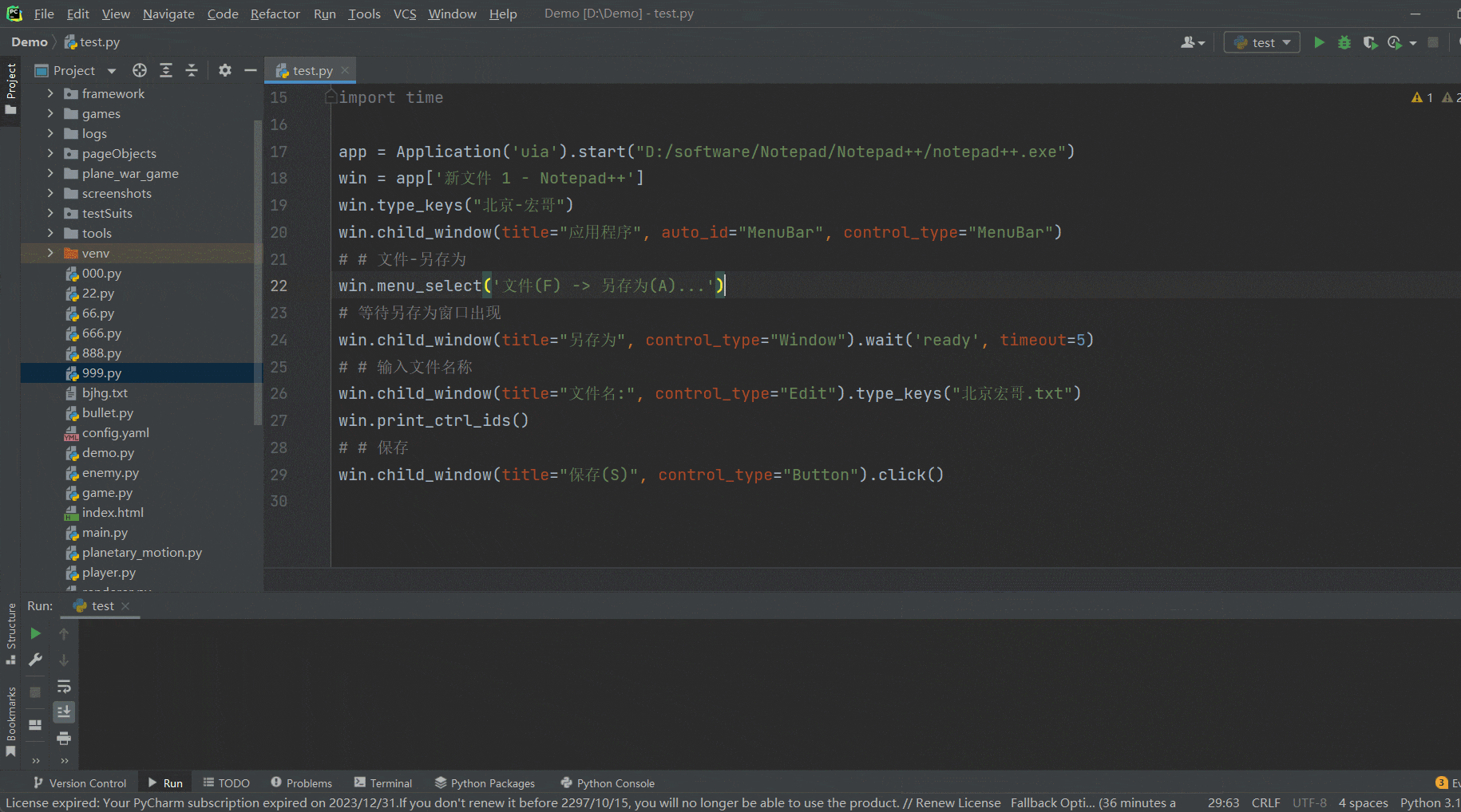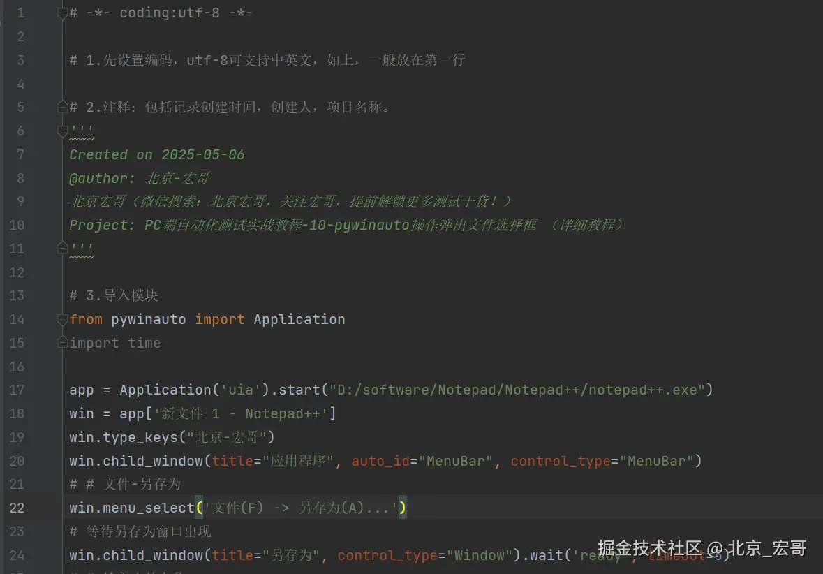 大致测试场景:启动电脑安装的Notepad++编辑器,然后在编辑器中输入“北京-宏哥”内容后,点击编辑器的“文件->另存为...”后,弹出文件选择框,修改文件名为:北京宏哥,最后点击“保存”按钮,保存文件。