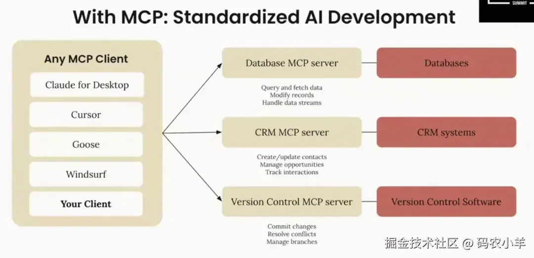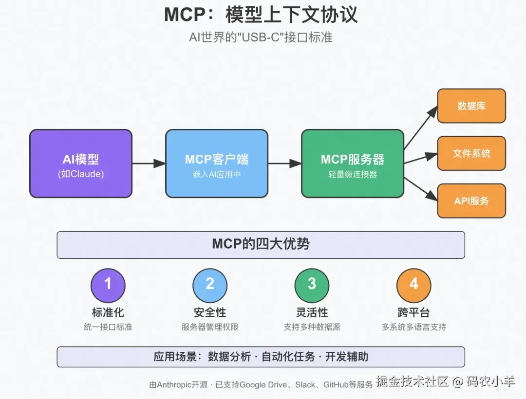 简单来说,MCP就是AI的“万能接口”。有了它,AI模型就能像插上USB-C线一样,轻松连接到各种外部数据源和工具,变得更聪明、更实用。不管是开发者还是普通用户,都能通过MCP让AI干更多事,而且过程简单又安全。未来随着MCP的普及,我们可能会看到更多能干实事儿的AI应用冒出来!