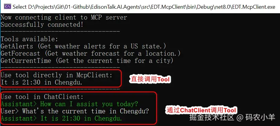 这个TimeTool就是我们定义的基于MCP的Tool,可以看到基于SDK提供的Attribute,可以方便地将其指定为MCP Server Tools。