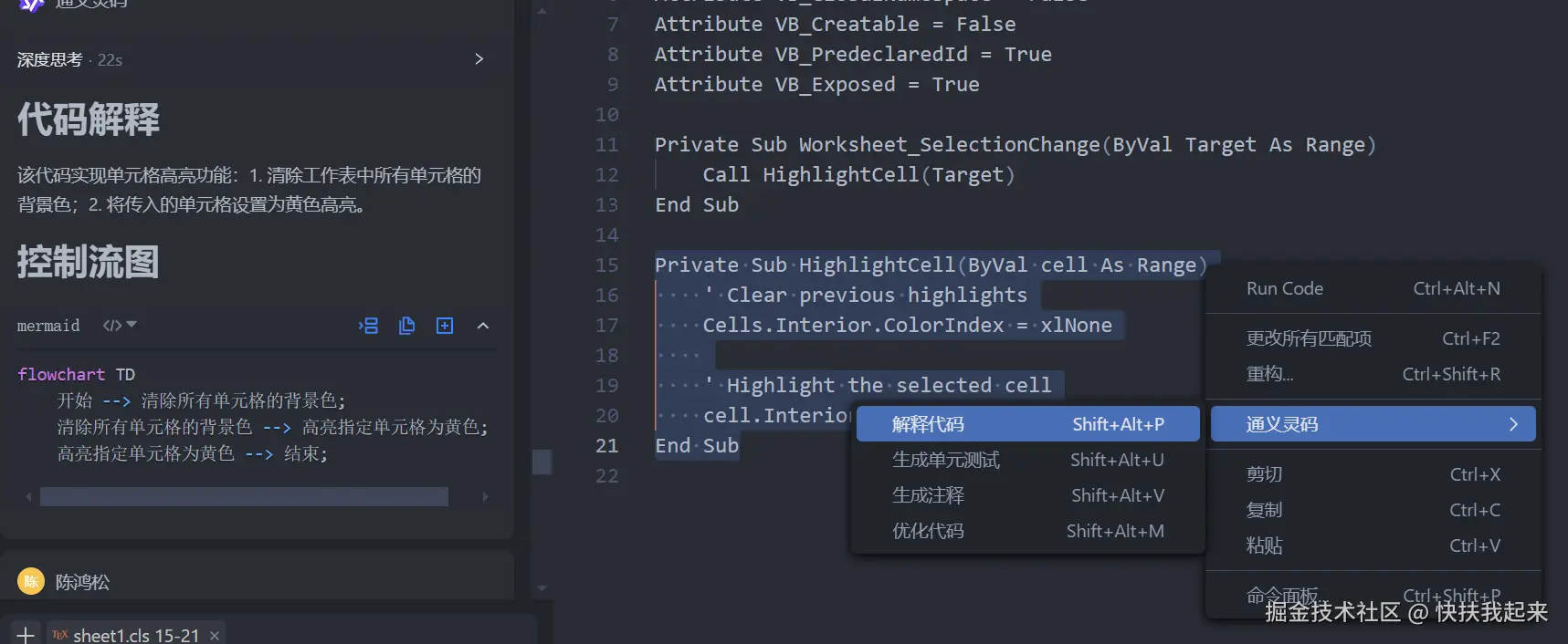在阅读他人编写的 VBA 代码时,如果缺乏注释难以理解其逻辑,可以使用 AI 生成注释,帮助我们快速把握代码的核心思想和实现细节。 - 完善自己代码的注释: