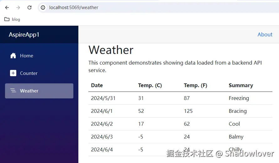 builder.Services.AddHttpClient<WeatherApiClient>(client => client.BaseAddress = new("http://apiservice")); //这里注入后端项目的API服务