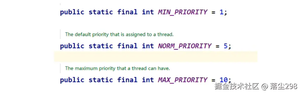 来看Thread类中优先级的设置,最小为1,最大为10,默认是5,优先级越高抢占到CUP的概率越高,只是说概率高,并不是优先级高的就肯定比优先级低的要先抢占到CUP