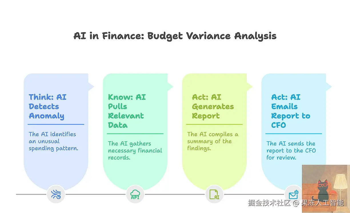 我们来点实际的。想象一下,一个财务团队在用 AI 助手帮忙做预算偏差分析。有了这三项能力,助手能自动发现季度开支中的异常(Think)、拉出上季度的账务条目作对比(Know),然后生成总结报告并发给 CFO(Act)。