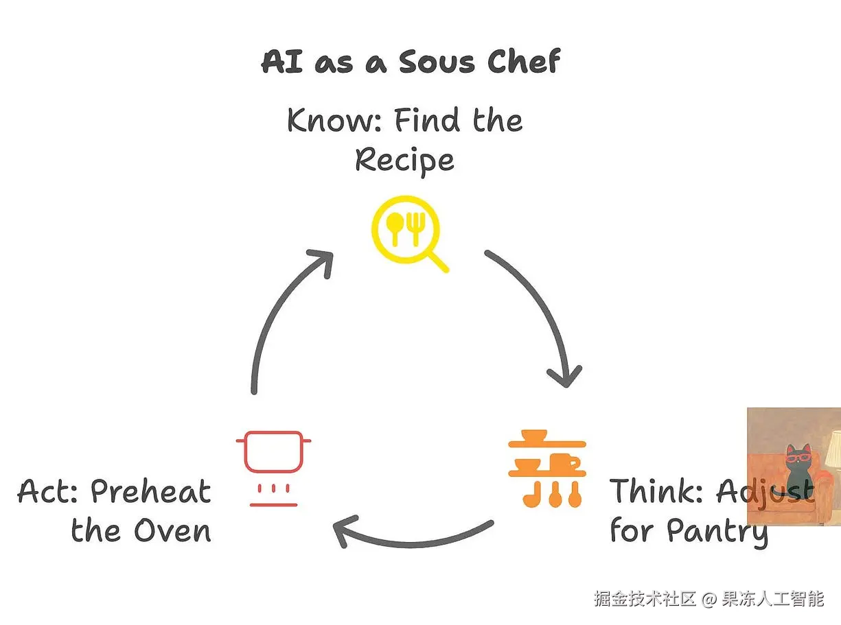 换种方式想 AI,也可以把它当成厨房里的副厨师,不是主厨,但是在后台让一切顺畅运行的人。Know 能力就像是找到完美食谱,它负责调出任务所需的准确信息。Think 是根据你厨房里到底有什么食材、今晚谁来吃饭,去调整那个食谱,进行规划和推理。而 Act,就是去预热烤箱、开火做饭,把计划变成现实。这不是为了取代你的专业,而是为了减少阻力、加快执行速度、放大已有成果。