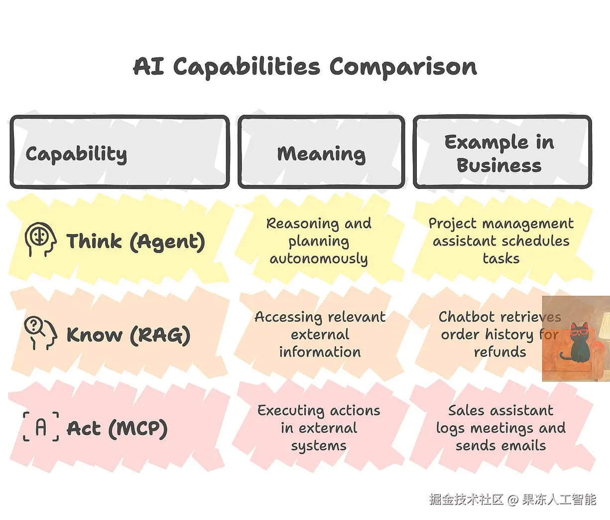 - Act(MCP) :能通过工具、系统、流程真正执行任务。MCP(模型上下文协议)让 AI 能对接 API 和企业系统,不光建议,还能真干事。