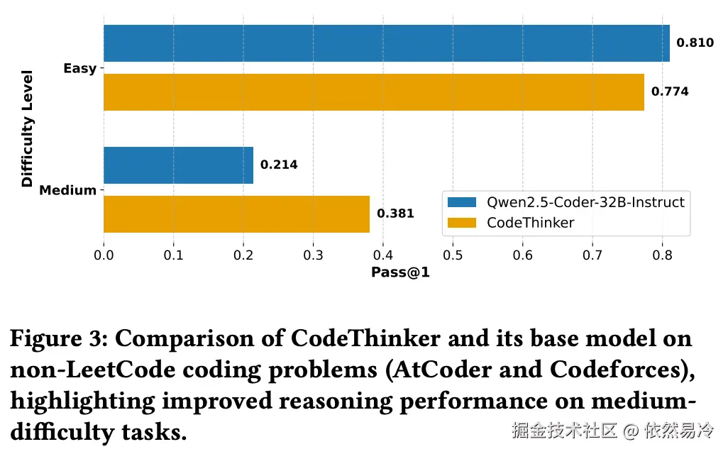 ① 【图3】在不同难度代码任务上,Qwen2.5-Coder-32B-Instruct 与 CodeThinker 对比,简单任务中前者 pass@1 略高;中等难度任务 CodeThinker 优势显著,其 pass@1 远高于前者。