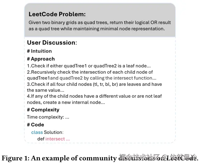 为什么要从软件工程社区中收集数据呢,作者举了图1的Leetcode例子,这些讨论是真实的、经过同行评审后的见解,非常有价值。
