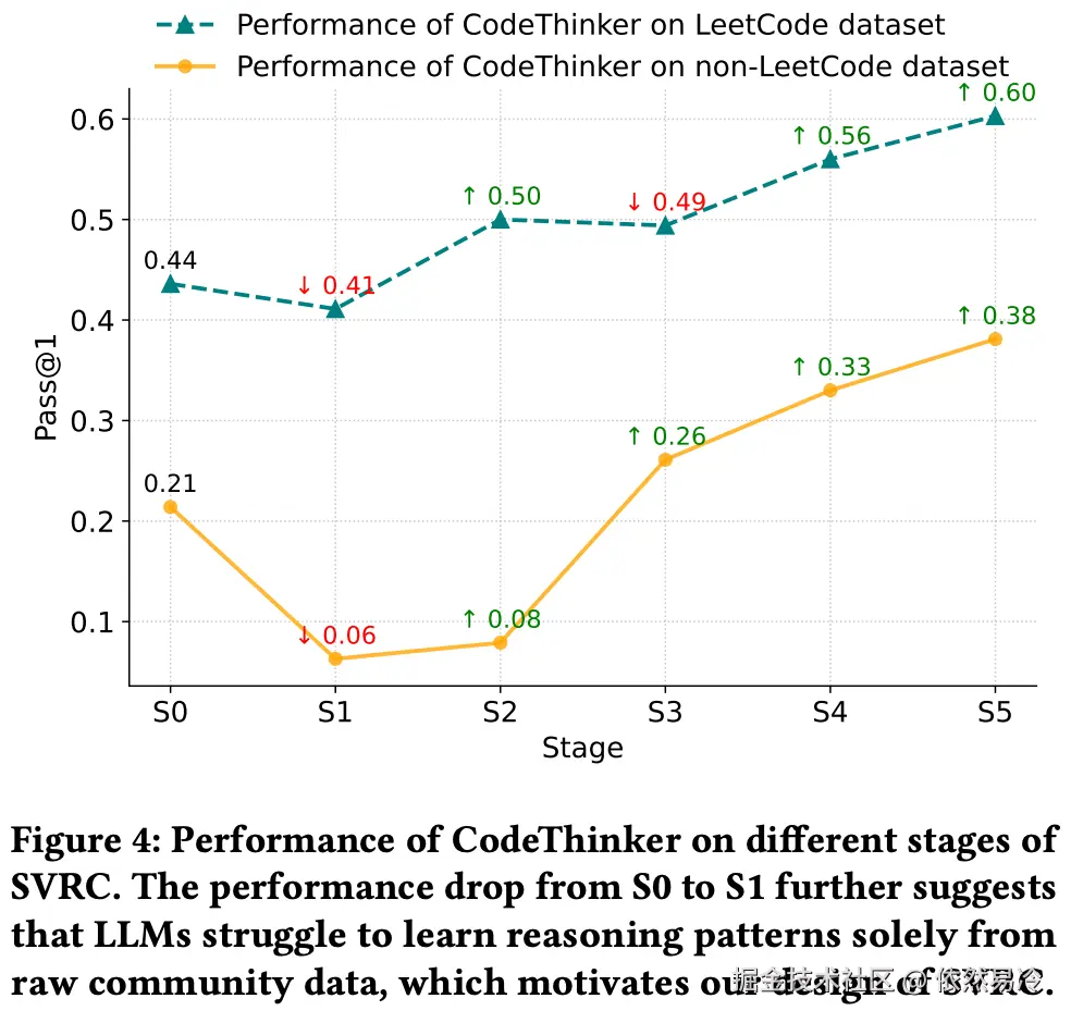 ① 【图4】在不同阶段(S0 - S5),CodeThinker 在 LeetCode 数据集和非 LeetCode 数据集上表现有波动,总体在 LeetCode 数据集上提升明显,非 LeetCode 数据集从 S2 起逐步上升,反映不同阶段对不同数据集性能影响有差异。每个阶段的定义论文中有,不赘述了。