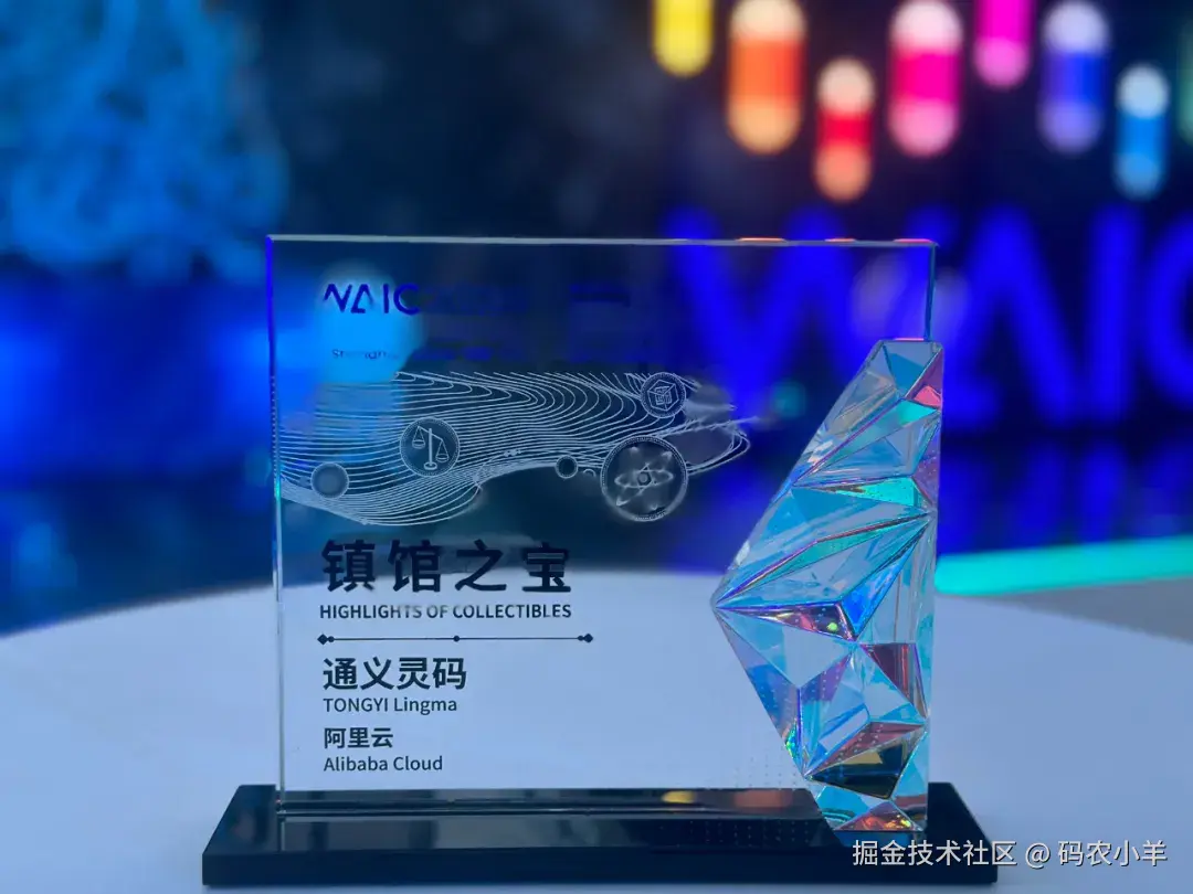 镇馆之宝是世界人工智能大会展览的最高荣誉,从科技含量、市场前景、创新性以及社会经济效益等维度综合考量评选,每年入选数量不超过 10 个,获奖产品不仅代表了当前人工智能领域的最新技术成果,还展示了未来的发展趋势和商业潜力。作为国内最受欢迎的辅助编程工具,通义灵码凭借在功能、性能、安全性以及应用落地等方面的优势成功入选。