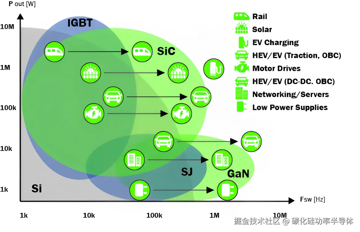 SiC在1200V及以上市场占据绝对优势,如电动汽车主驱逆变器、储能变流器,直接替代硅基IGBT,高压GaN目前难以竞争。