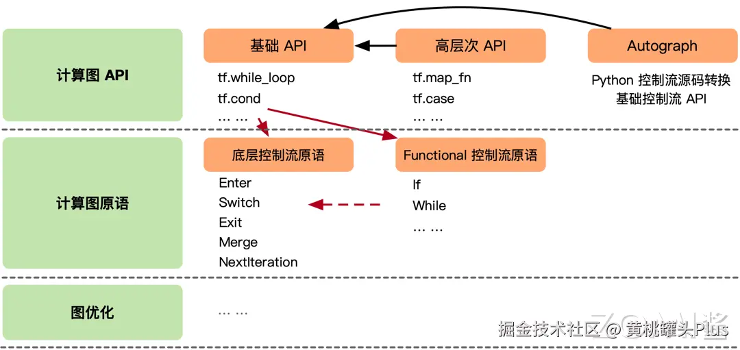TensorFlow 计算图中支持控制流的方案,主要分为 3 层。暴露给开发者用于构建计算图的前端 API,这些 API 会被转换成更低等级的控制流原语,再由计算图优化器进一步进行改写。为了平衡编程的易用性和优化器设计中保留更多易于被识别出的优化机会,TensorFlow 提供了多套有着不同抽象等级的前端 API 以及计算图上的控制流原语。