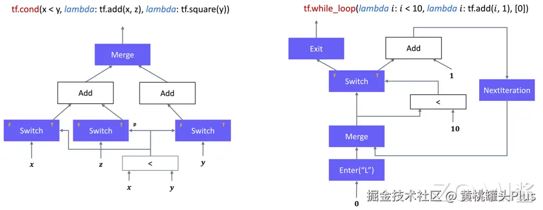 为了提高可理解性和编程效率避免开发者直接操作底层算子,这些计算图中的控制流原语会被封装为前端的控制流 API,下图是用户使用前端基础控制流 API 编写带条件和循环的计算,以及它们所对应的计算图表示。为了简化开发者识别计算图中的控制结构,TensorFlow 基于底层控制流原语,引入高层 Functional 控制流算子,同时添加高层控制流算子向底层控制流算子的转换逻辑。
