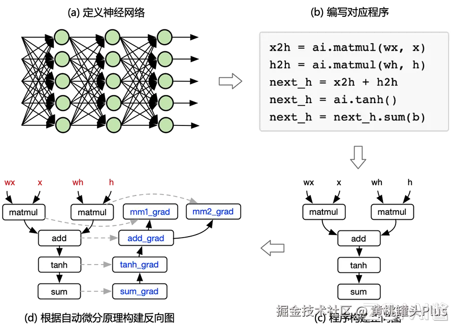 在前面的内容主要是讲述了 AI 框架在数学上对自动微分进行表达和处理,最后表示称为开发者和应用程序都能很好地去编写深度学习中神经网络的工具和库,整体流程如下所示: