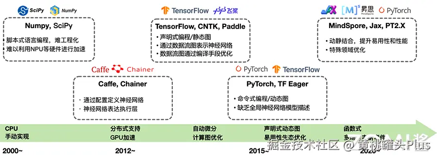 自此极大地推动了 AI 框架的发展,出现了 Caffe、Chainer 和 Theano 等具有代表性的早期 AI 框架,帮助开发者方便地建立复杂的神经网络模型(如 CNN、RNN、LSTM 等)。不仅如此,这些框架还支持多 GPU 训练,让开展更大、更深的模型训练成为可能。在这一阶段,AI 框架体系已经初步形成,声明式编程和命令式编程为下一阶段的 AI 框架发展的两条截然不同的道路做了铺垫。