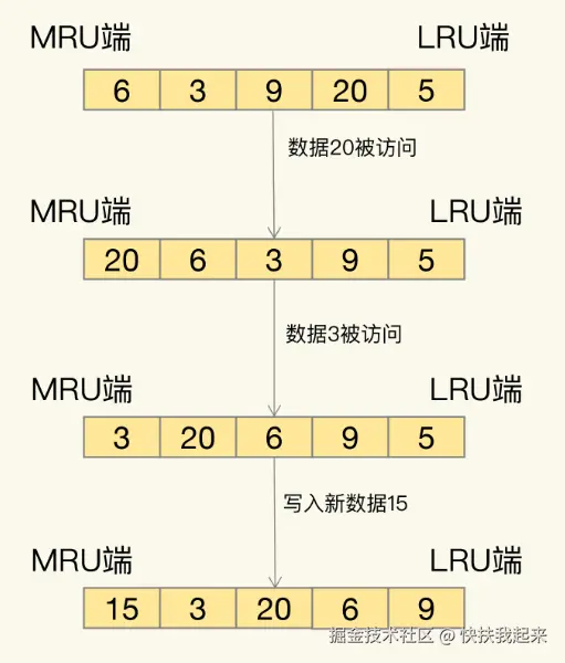 举个栗子:数据 20 和 3 被访问后,它们在链表中的位置移动到了 MRU 端,LRU 算法选择删除数据时,都是从 LRU 端开始,所以当新数据 15 被写入时,LRU 端的数据 5 被删除。LRU 算法在实际实现时,需要用链表管理所有的缓存数据,这会带来额外的空间开销。而且,当有数据被访问时,需要在链表上把该数据移动到 MRU 端,如果有大量数据被访问,就会带来很多链表移动操作,会很耗时,进而会降低 Redis 缓存性能。