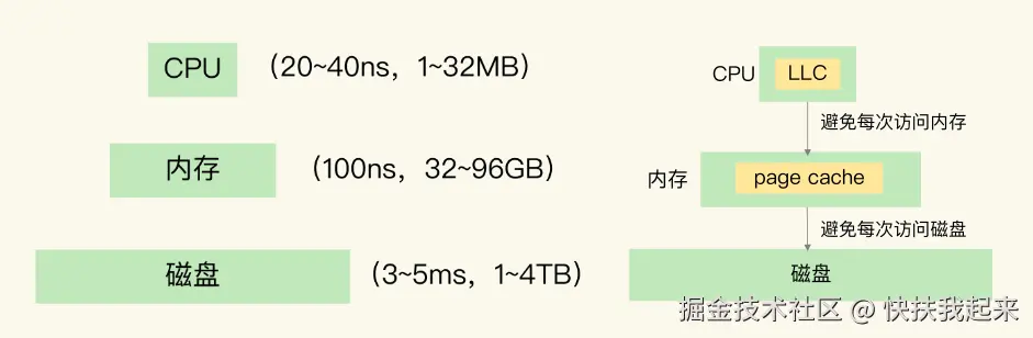 一个系统中不同层面数据访问速度不一样,以计算机为例,CPU、内存和磁盘这三层的访问速度从几十 ns 到 100ns,再到几 ms,性能的差异很大,如果每次 CPU 处理数据时都要到磁盘读取数据,系统运行速度会大大降低。