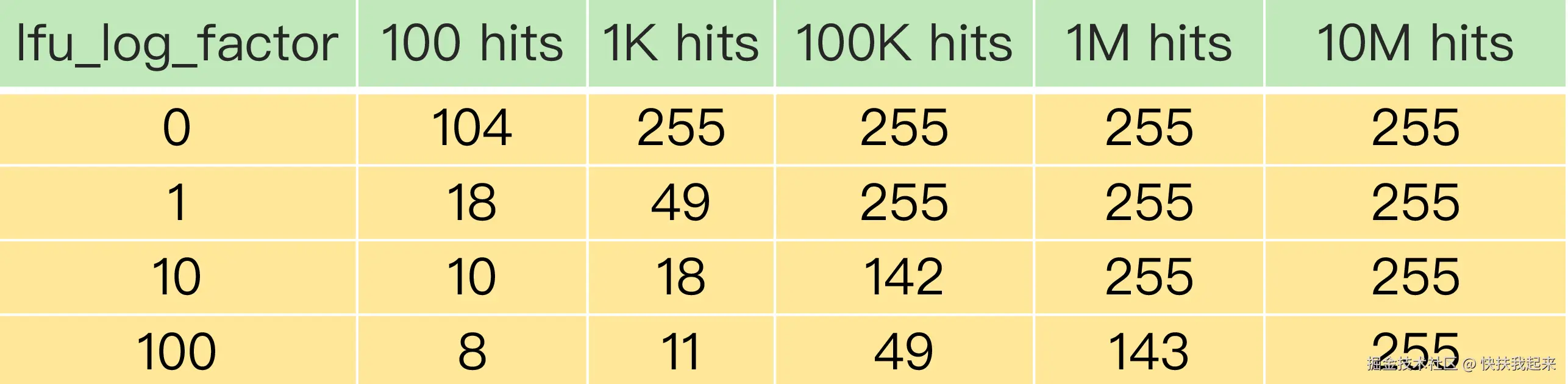 每当数据被访问一次时,首先,用计数器当前的值乘以配置项 lfu_log_factor 再加 1,再取其倒数,得到一个 p 值;然后,把这个 p 值和一个取值范围在(0,1)间的随机数 r 值比大小,只有 p 值大于 r 值时,计数器才加 1,通过设置不同的 lfu_log_factor 配置项,来控制计数器值增加的速度。以下是计算方式部分代码(baseval 当前值)和 lfu_log_factor 设置不同值的变化情况: