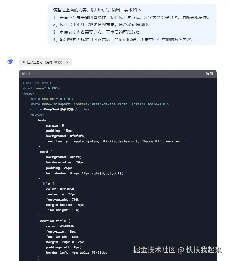 接着让 DeepSeek 梳理上述内容,并输出为 html 代码。