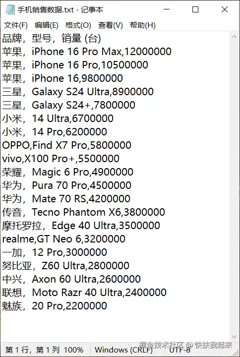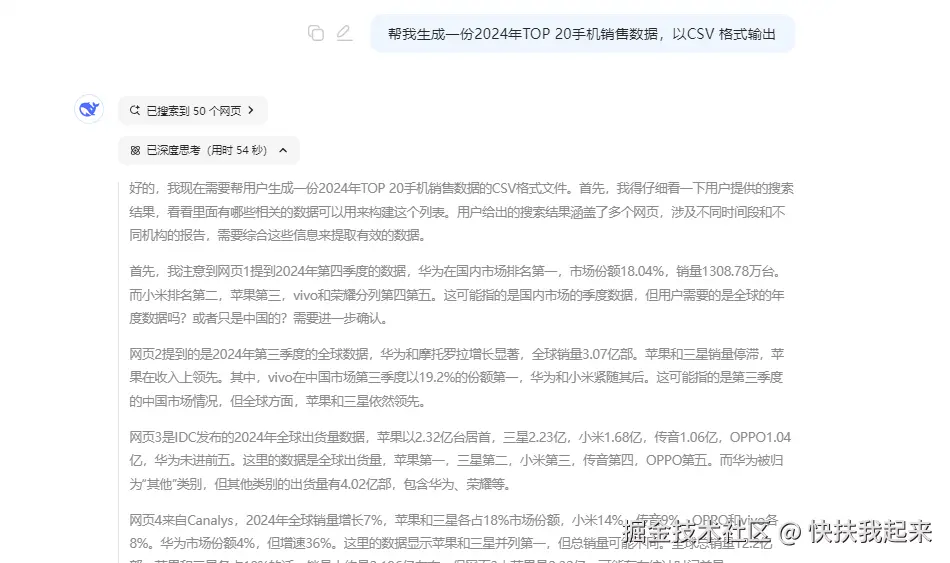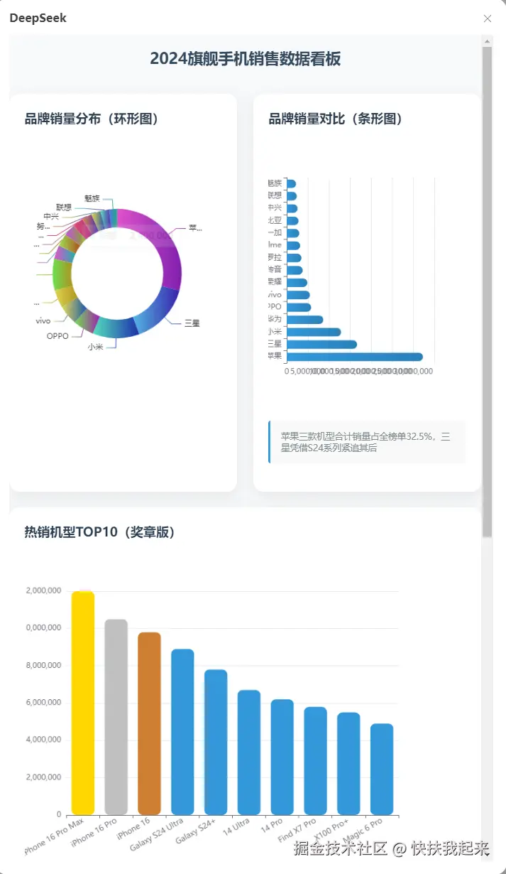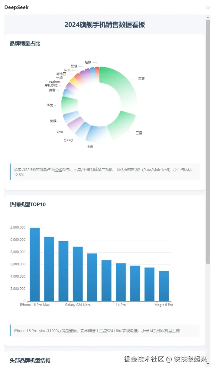 以 2024 年手机销售的数据来测试,数据可以自行整理准备,也可以向 DeepSeeK 提问,让它帮我们自动分析生成。