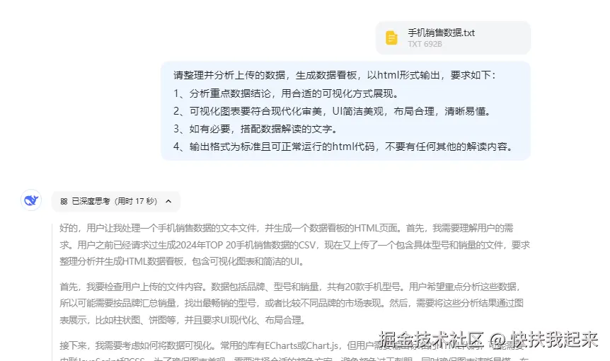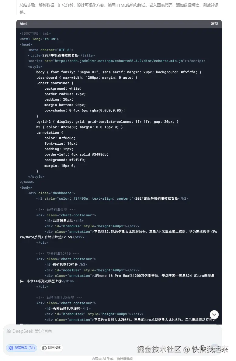 DeepSeek 会根据你的需求,先分析数据,再将分析的结果生成 HTML 代码。