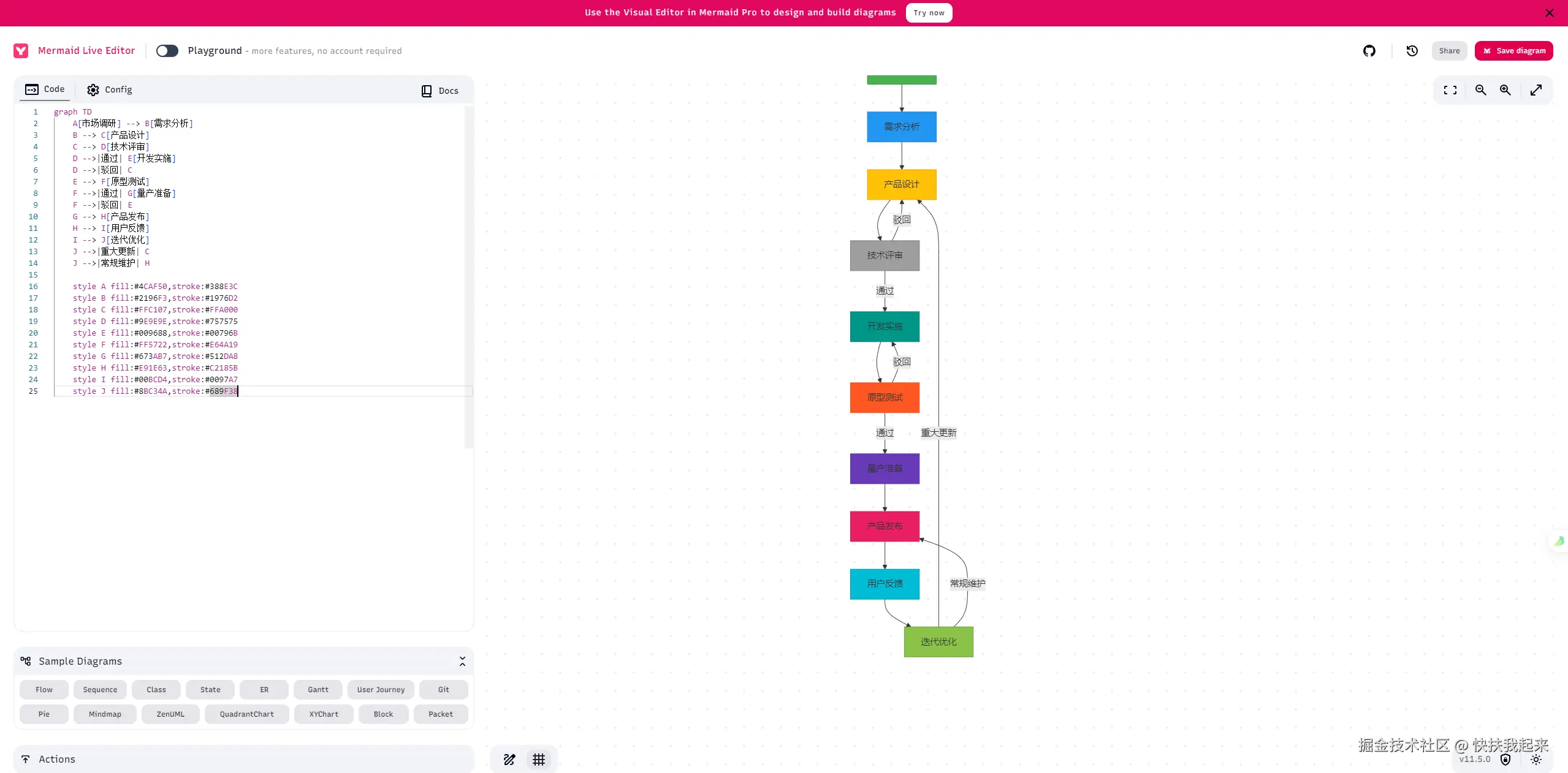 2、将代码复制到 mermaid 编辑器 (https://mermaid.live/) 中渲染,即可得到对应的流程图。