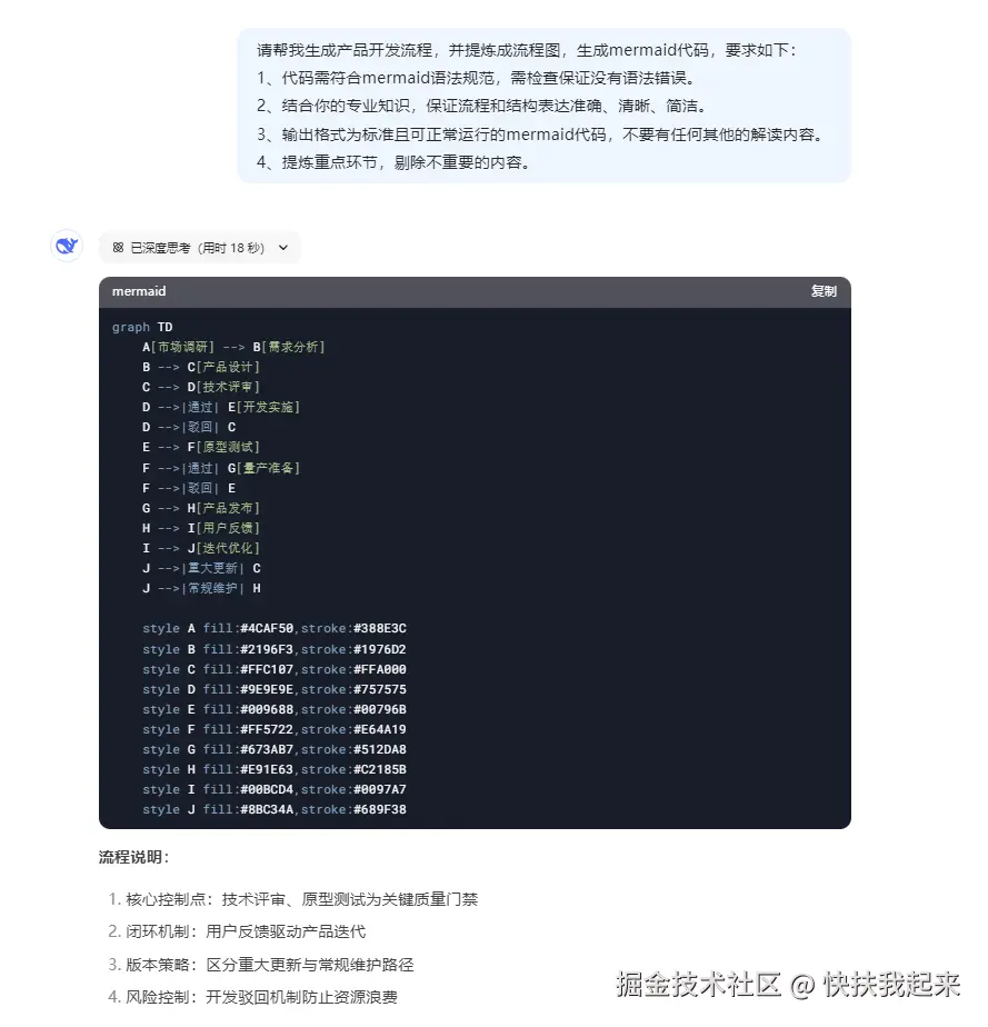 1、接下来以产品开发的流程图设计为例,在 DeepSeek 输入提示词,让它输出 mermaid 代码。